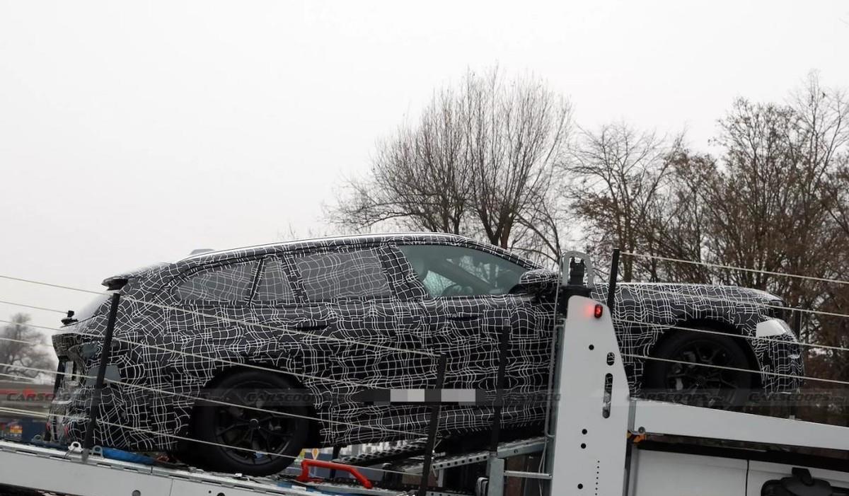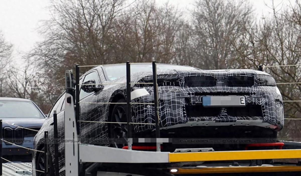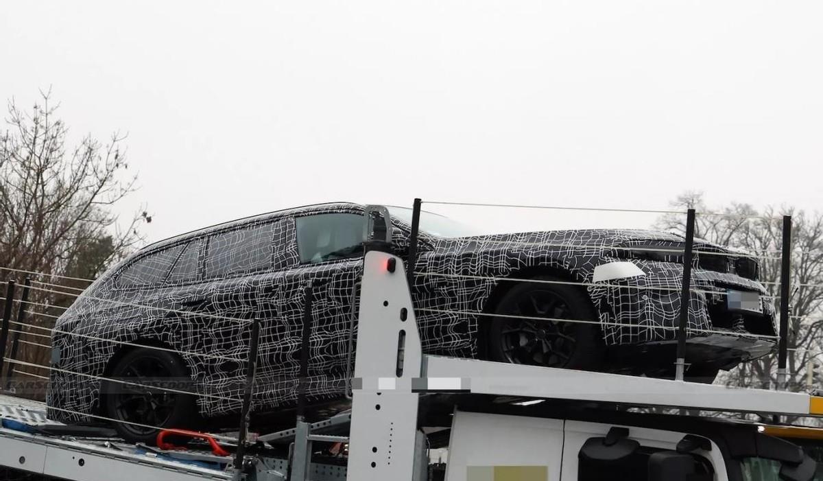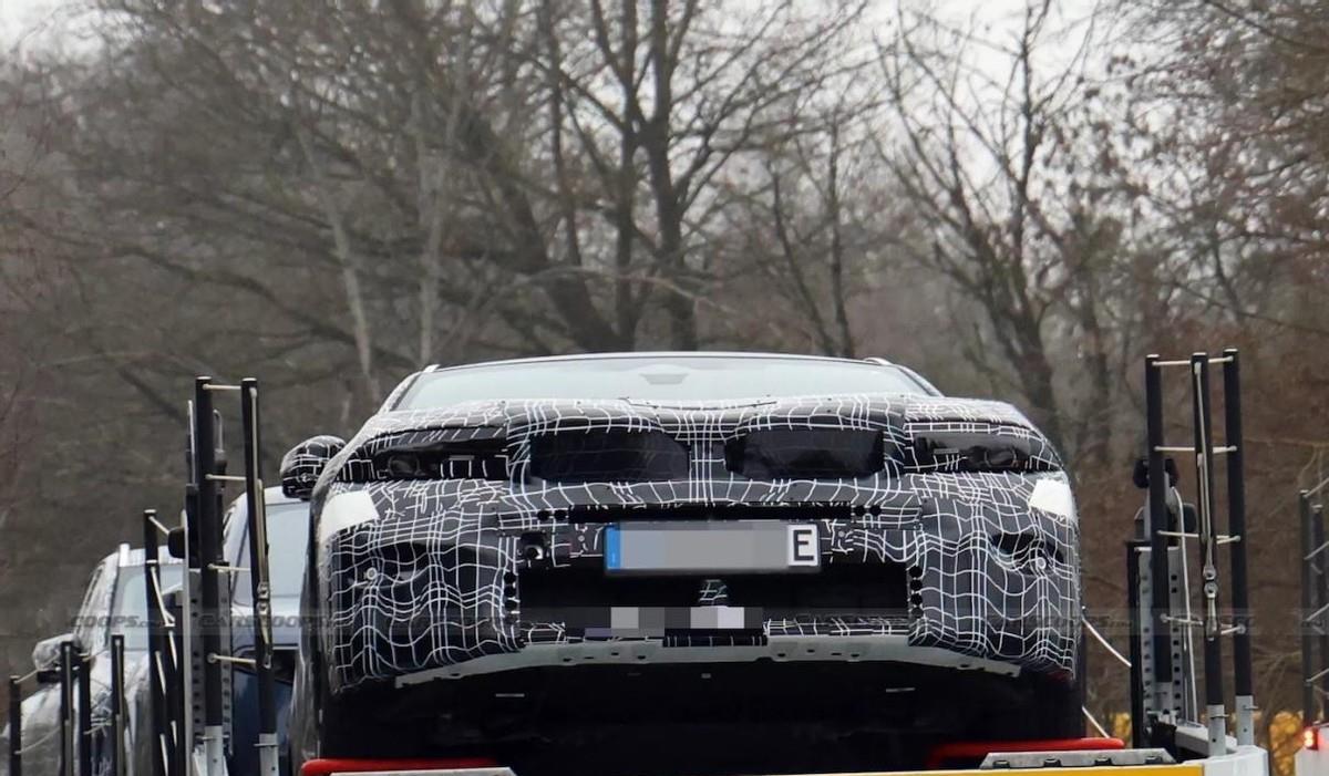 宝马5系旅行车这次出现在了一台汽车拖挂车上,虽说拍摄距离较远,但能清楚地看到,车头的部分虽然像现款宝马5系轿车一样保持了扁平效果,也在引擎舱结构上保有一定俯冲姿态,可V型装饰带依旧通过立体处置带来了更运动的效果。更重要的是,灯组与双肾格栅产生了新变化,它既不是完全沿用现款,也不是iX3那样的新设计。二者之间的联系更紧密了,但旅行车格栅中的CLAR风格依旧浓重,而大灯则产生了一些源自NK平台的飞翼式效果,这种新旧风格的融合还是挺让人兴奋的。